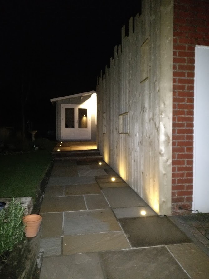 Warm LED patio lights installed in garden leading up to the new log cabin. These and other circuits run off a wireless garden switch.